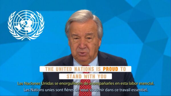 Under kvällen fick gästerna en videohälsning – av FN:s generalsekreterare Antonio Guterres. I talet lyfte han kooperationens kraft och möjligheter, som att bekämpa fattigdom och att arbeta för mat-säkerhet. Han lyfte också hur stolta FN är över att arbeta med dessa viktiga frågor.