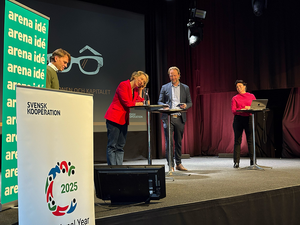 Gordon Hahn, verksamhetsledare för Coompanion Sverige, betonade behovet av att utmana den rådande ekonomiska berättelsen och att sätta kooperativt företagande i centrum: